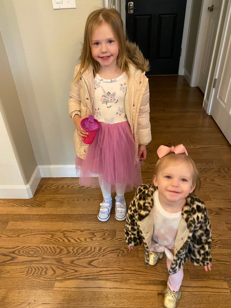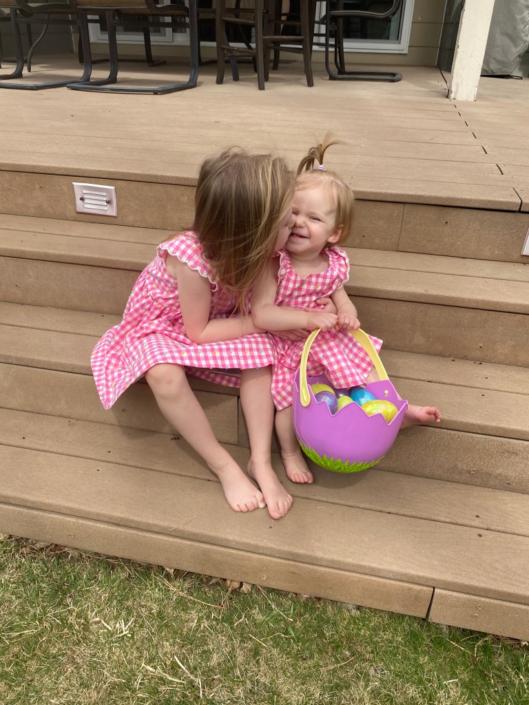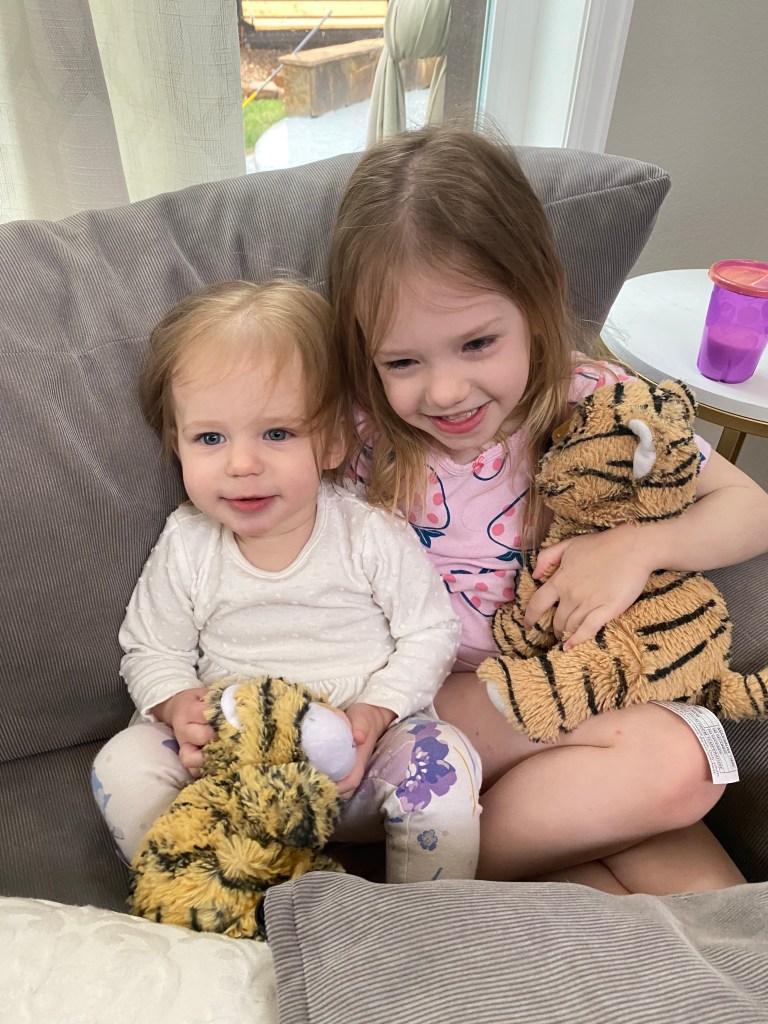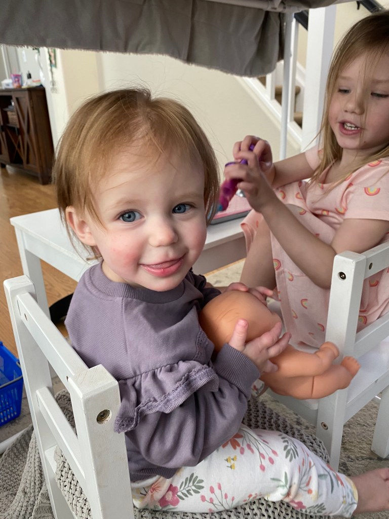 Layton and Londyn usually play really well together and they are still very obsessed with each other and will love on each other and give hugs and kisses and cuddles. It’s the sweetest relationship and I hope they stay close forever. Londyn will get a little annoyed when Layton continues to steal her toys but she is pretty good about sharing and helping sissy find a new toy. Layton isn’t into many specific toys, she likes kissing her baby dolls and playing with blocks but she usually is getting into things she shouldn’t have or trying to climb on things she shouldn’t be climbing on. She likes to sit on our kids sized table and chairs but then she gets excited and starts to climb on the chair and not just sit calmly haha so she is our wild child!