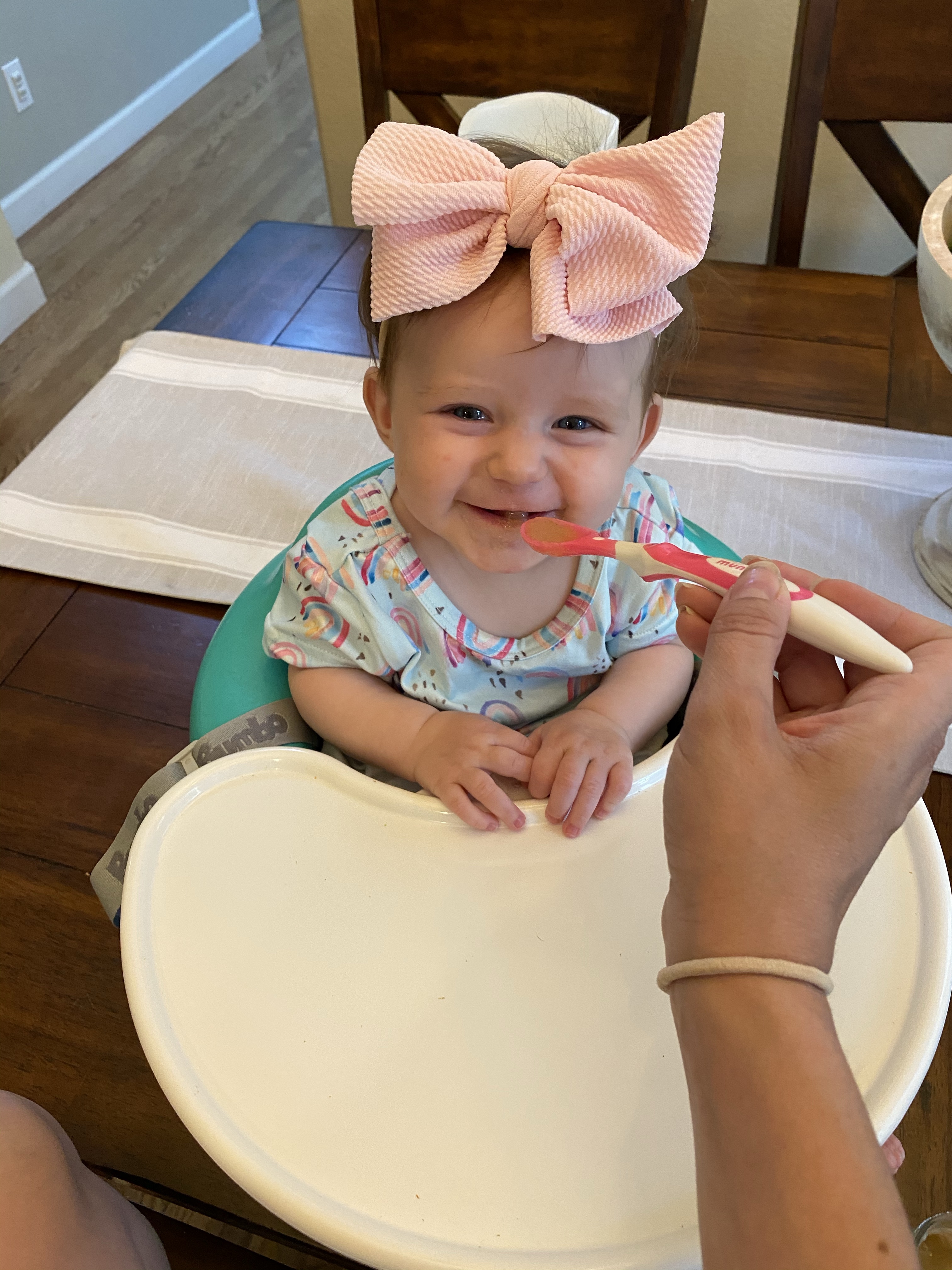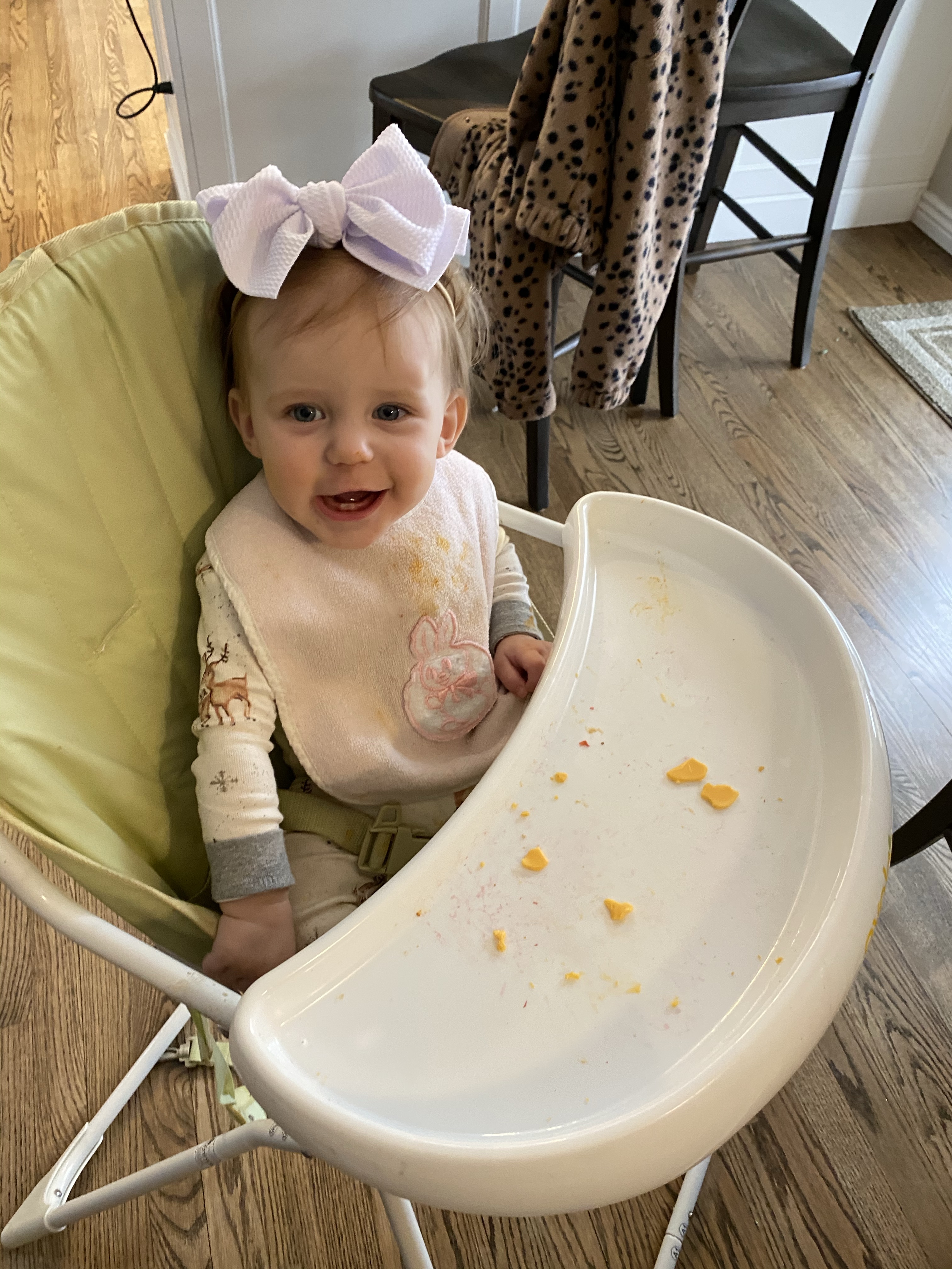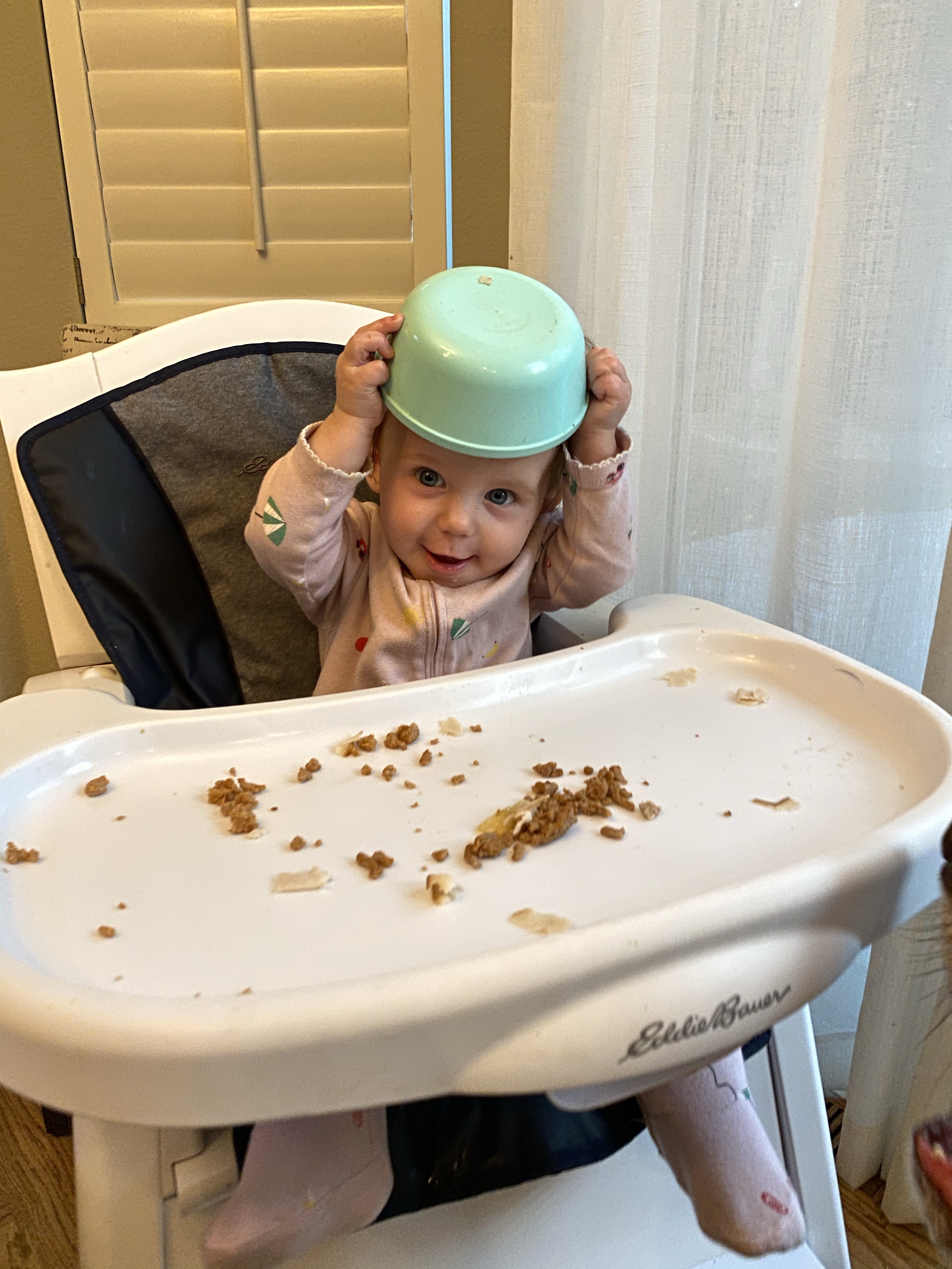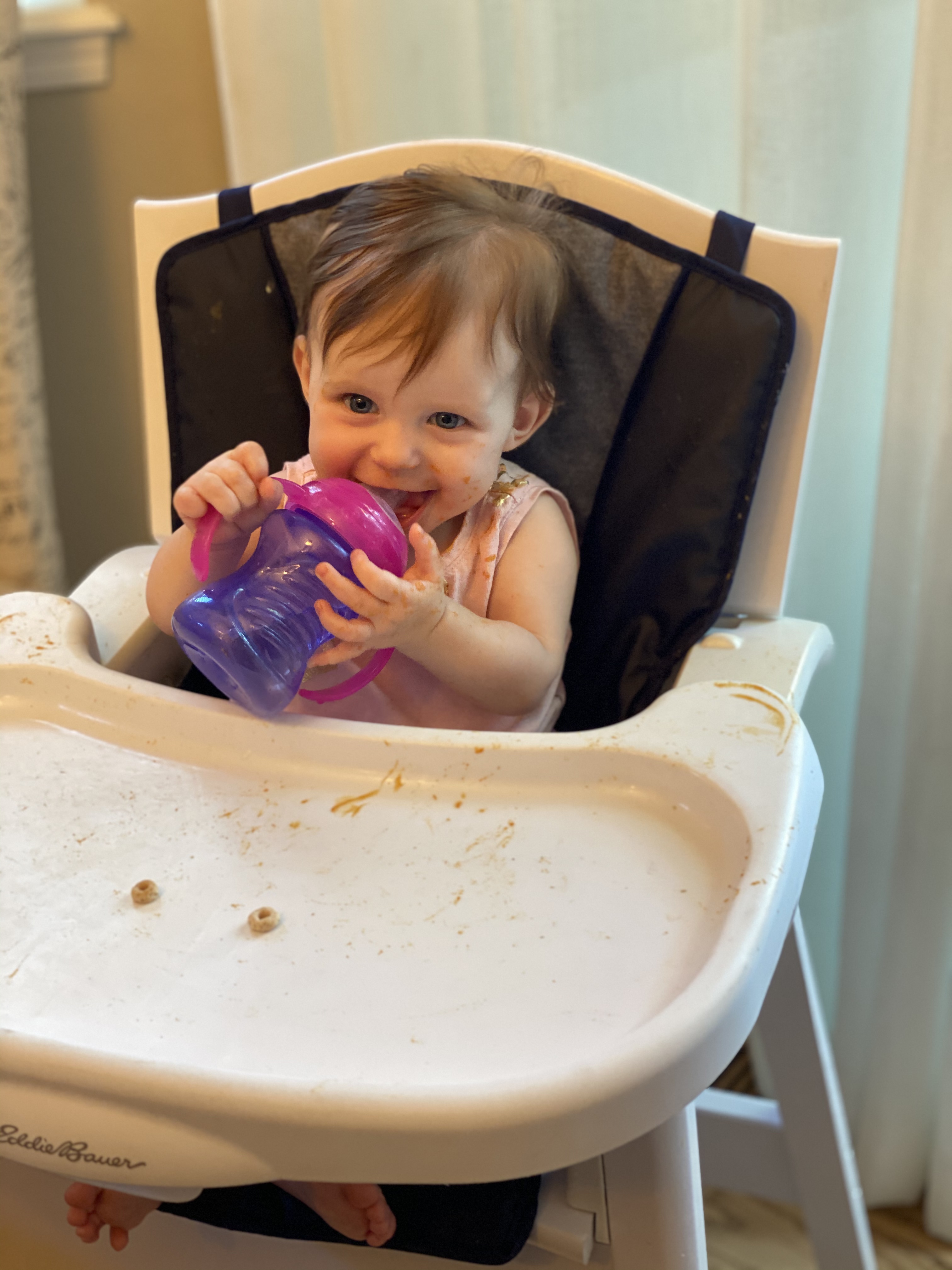 Layton loves to eat and will eat almost anything we give her. (unlike big sissy who is the pickiest eater). She will sign “more” when she wants more and she’s starting to say more too. She LOVES avocados, bananas, turkey, cheese, oatmeal… She is starting to feed herself with a spoon. I will put a little on her spoon and she is good about getting it into her mouth most of the time. She also loves her veggie pouches and she will feed herself those which is convenient. But when she is done in the highchair she is “ALL DONE”. She will start by giving her food to duke and say puppy!!!… like she is trying to convince us the puppy is hungry and needs some too..She loves feeding the puppy and it drives us crazy! She will then put her hands up and say ALL DONE or DONE. And its the cutest thing and we can’t even be mad that she feeds duke all her food ;). PUPPY is her favorite word and Duke is her favorite thing ever. They are the bestest friends.